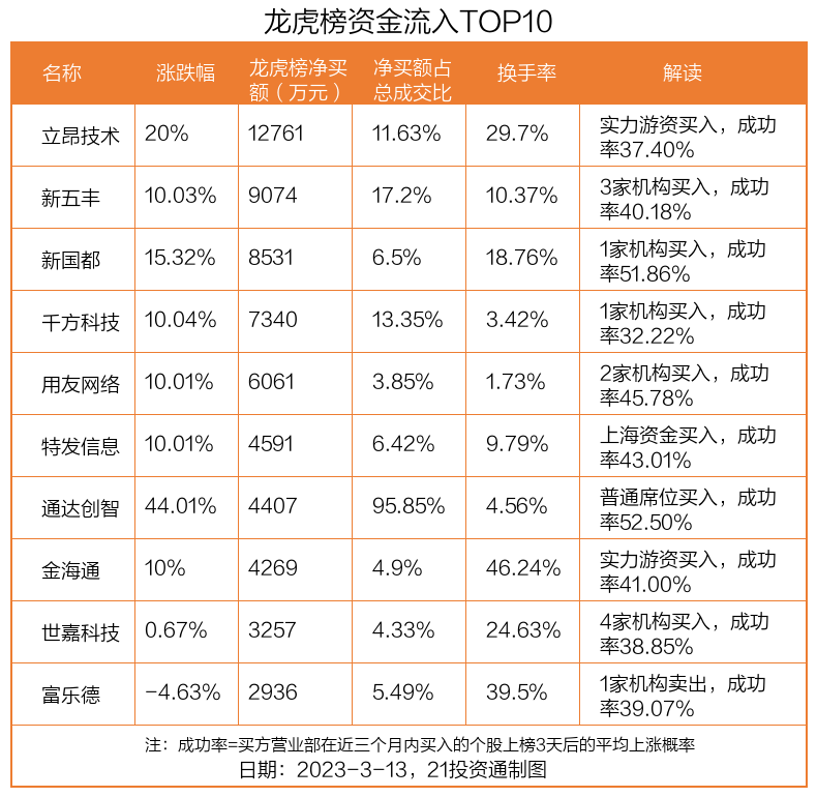 3月13日,上证指数上涨1.2%,深证成指上涨0.55%,创业板指下跌0.56%。盘后龙虎榜数据显示,共有35只个股因当日异动登上龙虎榜,资金净流入最多的是立昂技术(300603.SZ),达1.28亿元。