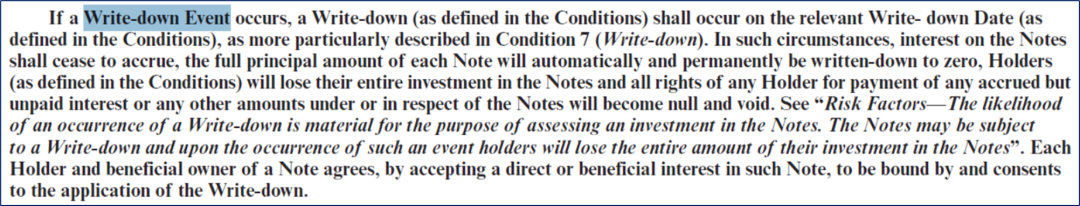 具体来看,此次瑞士信贷集团公开披露的有关AT1债券的发行条款。从中可以看出,如果发生减记事件,票据的利息将停止产生,每个票据的全部本金将自动永久地减计为零,持有人将失去其在票据中的全部投资,任何持有人支付任何应计但未支付的利息或票据项下或与票据有关的任何其他金额的所有权利将无效。参见“风险因素——发生减计的可能性对于评估债券投资的目的是重要的。这些债券可能会被减记,一旦发生此类事件,持有人将失去他们在这些债券上的全部投资。”票据的每个持有人和实益拥有人通过接受该票据的直接或实益权益,同意受减计的约束并同意减记的申请。