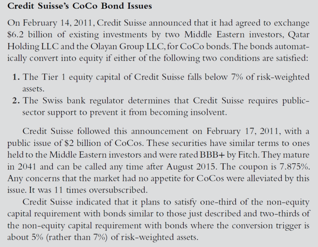 翻开经典的金融风险管理教科书,发现早在2011年,瑞信就发行了CoCo债券。其中提到该未定可转换债券满足以下条件之一,将自动转换为股权: