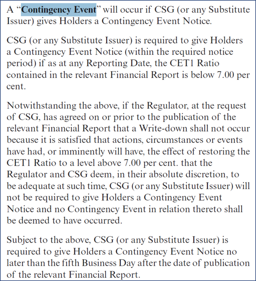 “减计事件”是指“意外事件”或“生存能力事件”。如果CreditSuisse Group AG (CSG或任何替代发行人)向持有人发出“突发事件通知”,则将发生“意外事件”。如在任何报告日,有关财务报告所载的CET1比率低于7.00%,CSG(或任何替代发行人)须向持有人发出意外事件通知(在规定的通知期内)