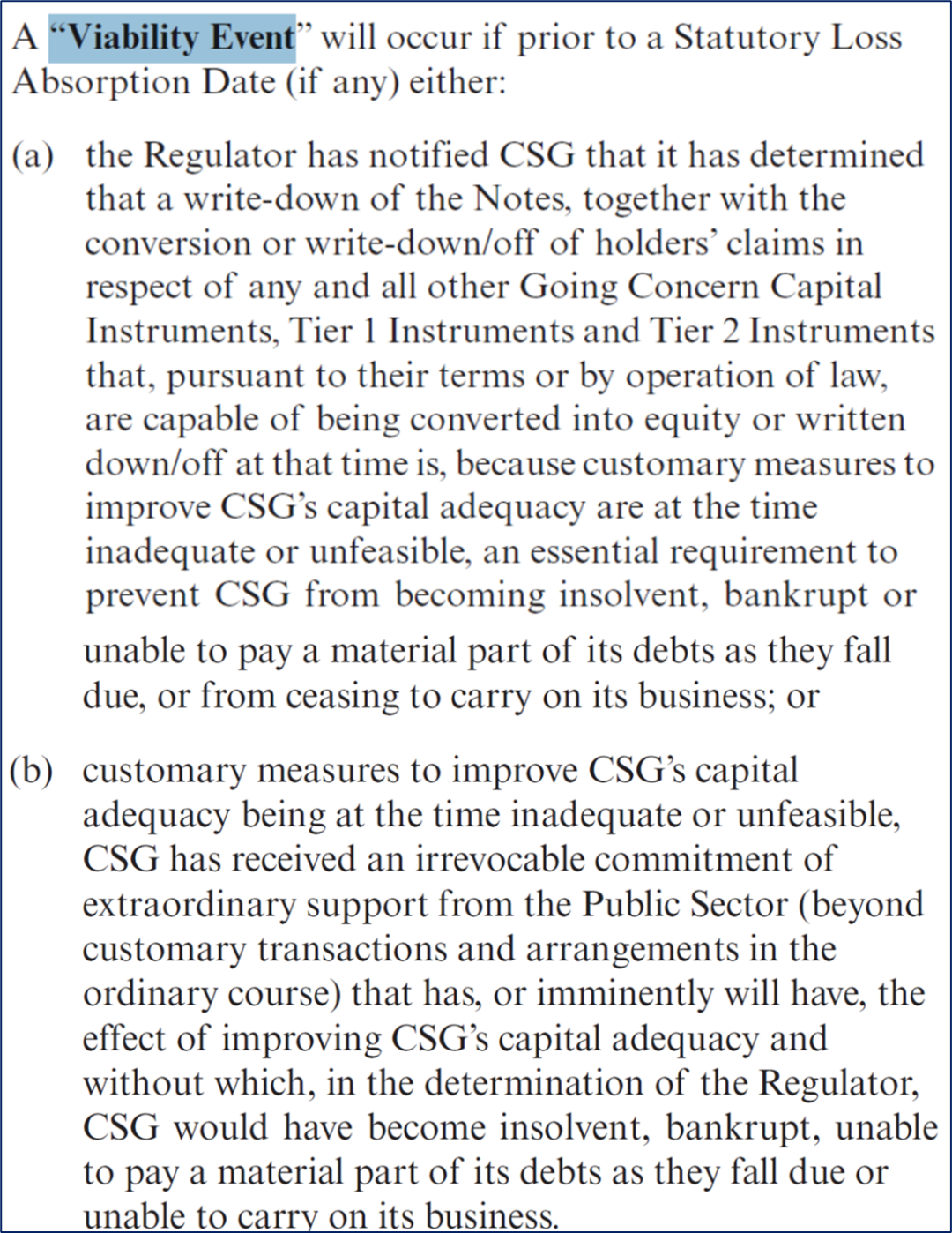(a) 监管机构已通知瑞士信贷集团,其已确定,由于改善瑞信信贷集团资本充足率的惯常措施在当时是不充分或不可行的,要防止瑞信信贷集团资不抵债、破产或无法支付其到期的大部分债务,或停止经营其业务,有关任何及所有其他持续经营资本工具、第一级工具和第二级工具的票据减记,以及持有人债权的转换或减记/注销,在当时是一项必不可少的要求;或