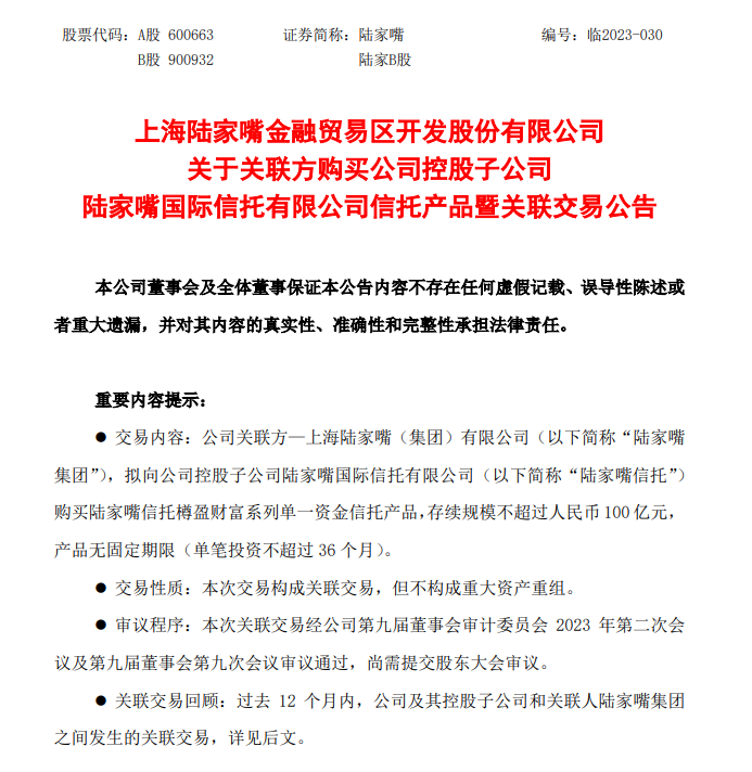 3月31日,陆家嘴(SH600663)发布财报披露陆家嘴信托财务数据,同时公告拟向控股子公司陆家嘴信托购买陆家嘴信托樽盈财富系列单一资金信托产品,存续规模不超过人民币100亿元。