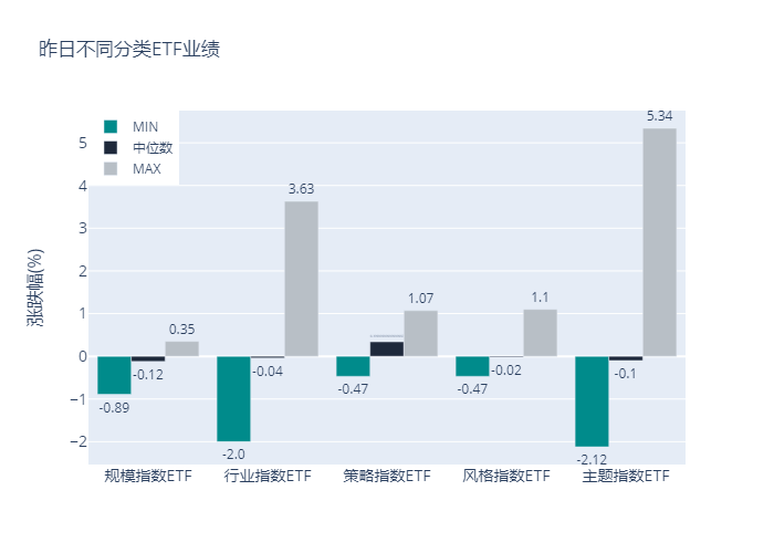 昨日股票型ETF收益率中位数为-0.1%。其中按照不同分类,规模指数中万家国证2000ETF收益率最高,为0.35%;行业指数中香港医药收益率最高,为3.63%;策略指数中红利LV收益率最高,为1.07%;风格指数中交银深证300价值ETF收益率最高,为1.1%;主题指数中影视ETF收益率最高,为5.34%。