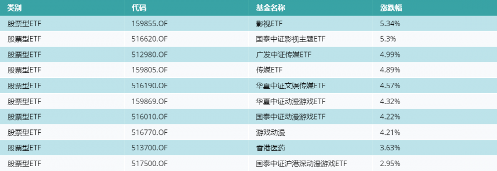 昨日股票型ETF涨幅最高的3支ETF及其收益率分别为:影视ETF(5.34%)、国泰中证影视主题ETF(5.3%)、广发中证传媒ETF(4.99%)。涨幅前10详情见下表: