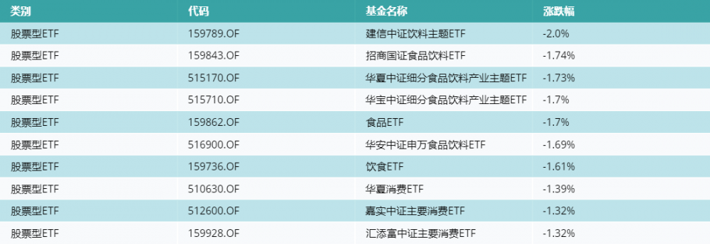 昨日股票型ETF跌幅最大的3支ETF及其收益率分别为:建信中证饮料主题ETF(-2.0%)、招商国证食品饮料ETF(-1.74%)、华夏中证细分食品饮料产业主题ETF(-1.73%)。跌幅前10详情见下表:
