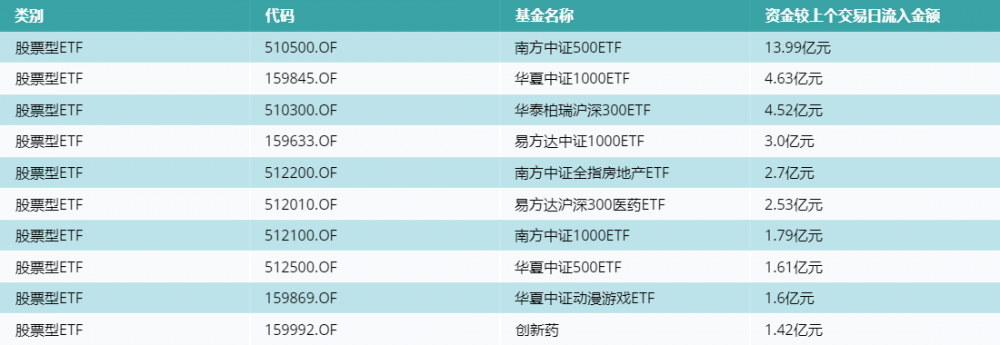 昨日股票型ETF资金流入最多的3支ETF及其流入金额分别为:南方中证500ETF(流入13.99亿元)、华夏中证1000ETF(流入4.63亿元)、华泰柏瑞沪深300ETF(流入4.52亿元)。资金流入前10详情见下表: