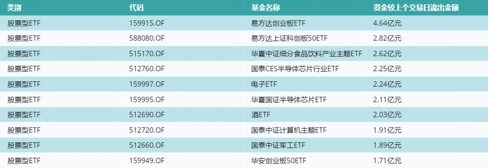 昨日股票型ETF资金流出最多的3支ETF及其流入金额分别为:易方达创业板ETF(流出4.64亿元)、易方达上证科创板50ETF(流出2.82亿元)、华夏中证细分食品饮料产业主题ETF(流出2.62亿元)。资金流出前10详情见下表:
