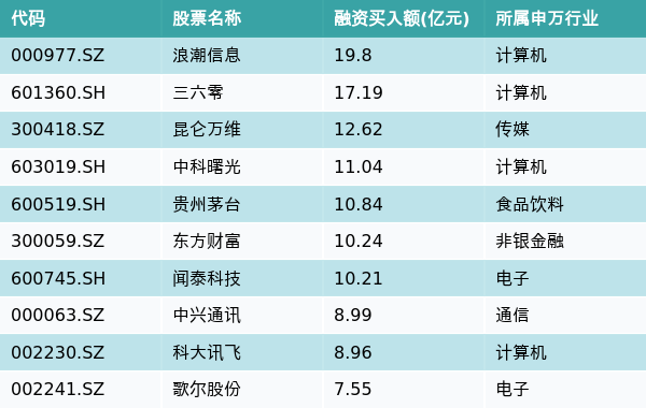 4月12日,两市共有3147只个股有融资资金买入,其中浪潮信息、三六零、昆仑万维排名前三,买入金额分别19.8亿元、17.19亿元、12.62亿元。融资买入额前10个股详情见下表: