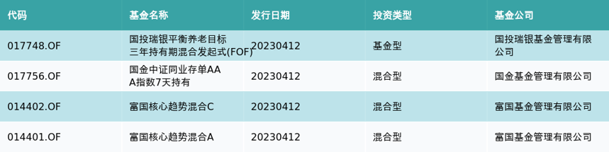 4月12日有4只新基金发行,分别为:国投瑞银平衡养老目标三年持有期混合发起式(FOF)、国金中证同业存单AAA指数7天持有、富国核心趋势混合C、富国核心趋势混合A,详情见下表: