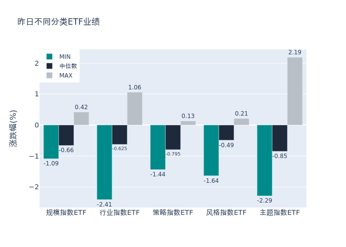 昨日股票型ETF收益率中位数为-0.78%。其中按照不同分类,规模指数中科创ETF收益率最高,为0.42%;行业指数中嘉实上证科创板新一代信息技术ETF收益率最高,为1.06%;策略指数中红利LV收益率最高,为0.13%;风格指数中嘉实新兴科技100ETF收益率最高,为0.21%;主题指数中影视ETF收益率最高,为2.19%。
