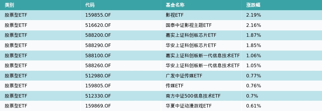 昨日股票型ETF涨幅最高的3支ETF及其收益率分别为:影视ETF(2.19%)、国泰中证影视主题ETF(2.16%)、嘉实上证科创板芯片ETF(1.87%)。涨幅前10详情见下表: