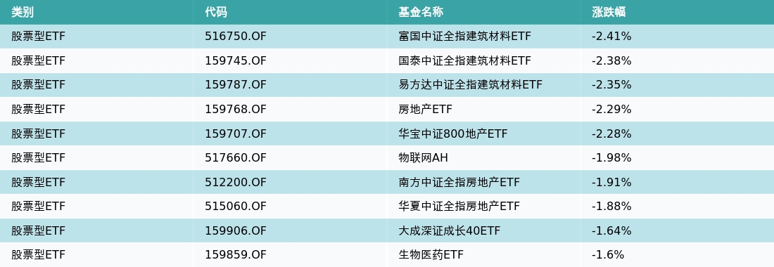 昨日股票型ETF跌幅最大的3支ETF及其收益率分别为:富国中证全指建筑材料ETF(-2.41%)、国泰中证全指建筑材料ETF(-2.38%)、易方达中证全指建筑材料ETF(-2.35%)。跌幅前10详情见下表: