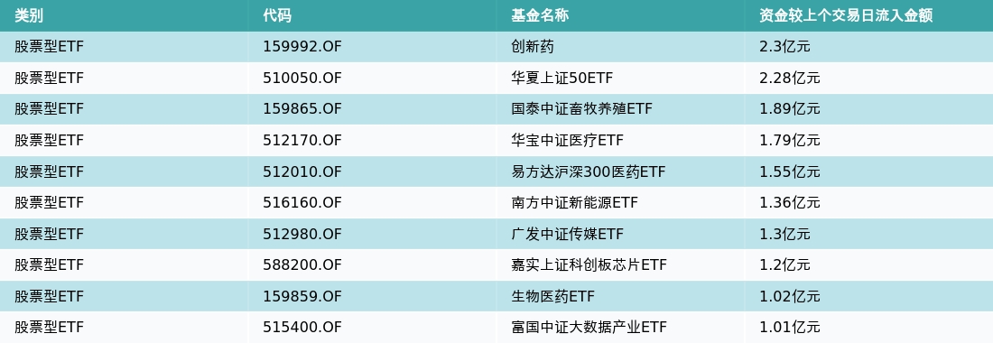 昨日股票型ETF资金流入最多的3支ETF及其流入金额分别为:创新药(流入2.3亿元)、华夏上证50ETF(流入2.28亿元)、国泰中证畜牧养殖ETF(流入1.89亿元)。资金流入前10详情见下表: