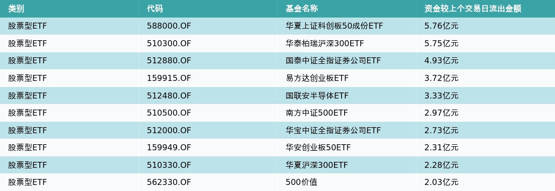 昨日股票型ETF资金流出最多的3支ETF及其流入金额分别为:华夏上证科创板50成份ETF(流出5.76亿元)、华泰柏瑞沪深300ETF(流出5.75亿元)、国泰中证全指证券公司ETF(流出4.93亿元)。资金流出前10详情见下表: