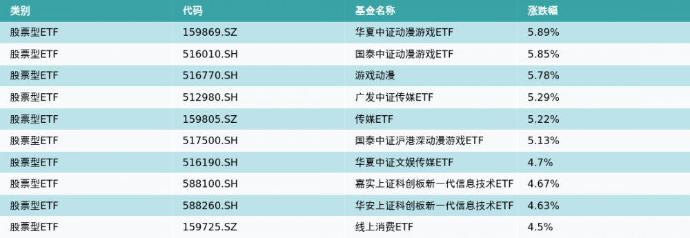 昨日股票型ETF涨幅最高的3支ETF及其收益率分别为:华夏中证动漫游戏ETF(5.89%)、国泰中证动漫游戏ETF(5.85%)、游戏动漫(5.78%)。涨幅前10详情见下表:
