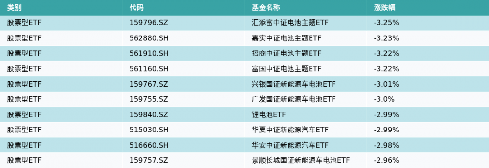 昨日股票型ETF跌幅最大的3支ETF及其收益率分别为:汇添富中证电池主题ETF(-3.25%)、嘉实中证电池主题ETF(-3.23%)、招商中证电池主题ETF(-3.22%)。跌幅前10详情见下表: