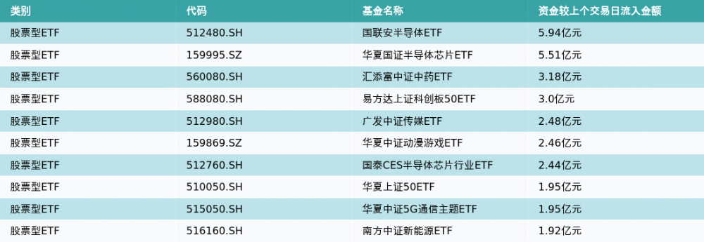昨日股票型ETF资金流入最多的3支ETF及其流入金额分别为:国联安半导体ETF(流入5.94亿元)、华夏国证半导体芯片ETF(流入5.51亿元)、汇添富中证中药ETF(流入3.18亿元)。资金流入前10详情见下表: