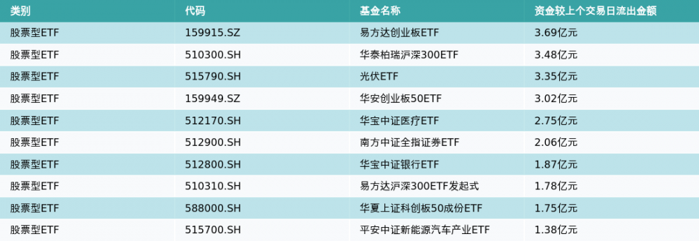 昨日股票型ETF资金流出最多的3支ETF及其流入金额分别为:易方达创业板ETF(流出3.69亿元)、华泰柏瑞沪深300ETF(流出3.48亿元)、光伏ETF(流出3.35亿元)。资金流出前10详情见下表: