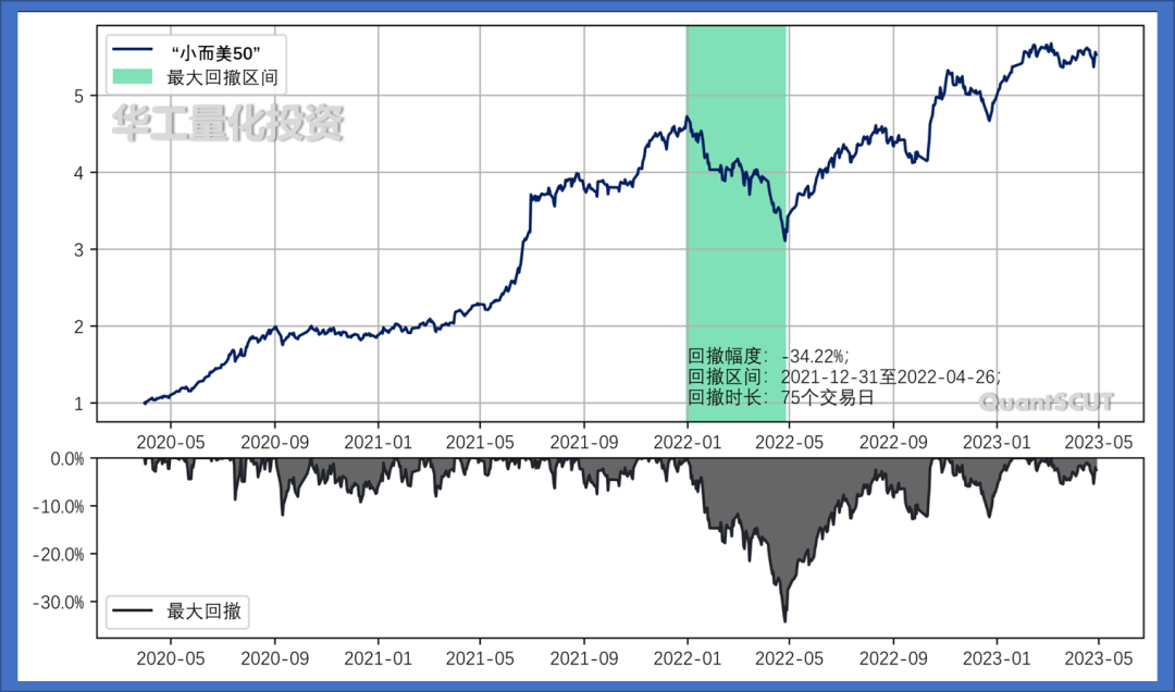 2020年到2023年4月底小而美50的业绩不断创新高,期间在2021年底到2022年4月发生了34%的回撤。年化收益率达到了77%,夏普比率也有2.85,业绩远远跑赢沪深300指数。