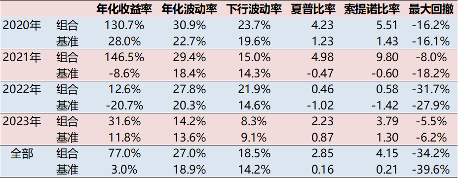 从分年业绩来看,2022年和2021年业绩最好,分别实现了130%和146%的收益。2022年尽管发生了较大的回撤,但收益仍有12.6%,相比之下,沪深300指数2022年亏损了20.7%。2023年组合的业绩更是达到了31.6%,且继续创新高。