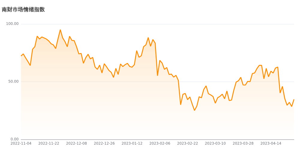 今日南财市场情绪指数为34.8,较前一交易日28.5大幅上涨,市场投资热度明显提升。