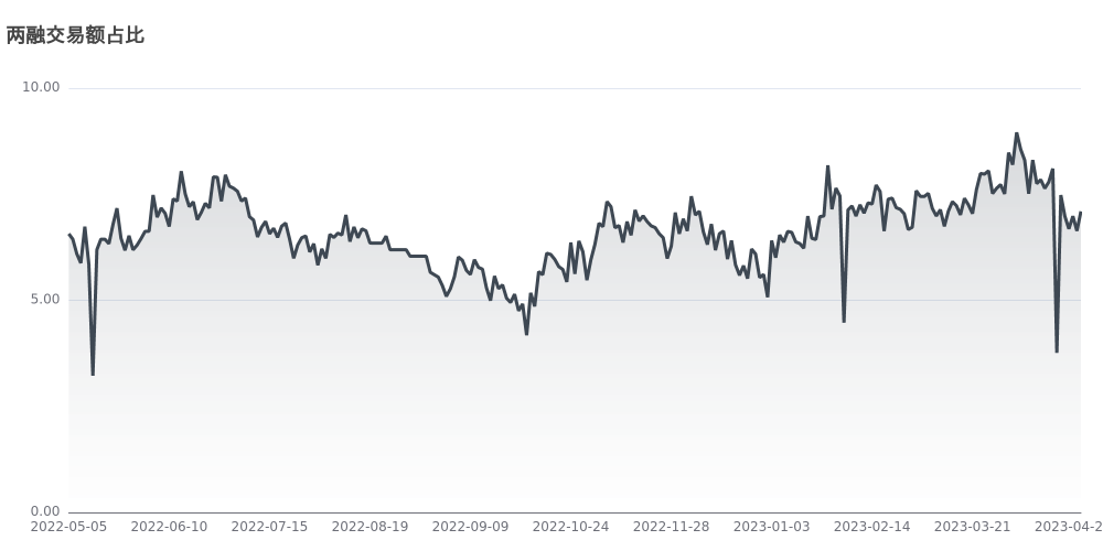 今日该指标值为7.10%,目前该指标处于近一年较高区间,认为当前A股市场相对较强。反映场内投资者借钱炒股的杠杆水平,该指标越高说明杠杆水平越高,即投资者认为当前市场较强,反之则说明投资者认为市场相对较弱,因而与上证指数存在较强的正相关性。