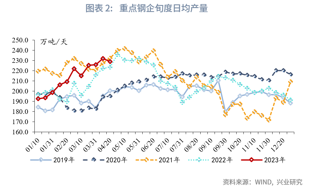 2023年4月工业增加值将继续保持疫后反弹趋势,同时较低的基数对同比读数形成明显提振。粗钢产量保持2019年至今同期的较高水平,PTA产业链与轮胎开工率环比涨跌互现,但均显著高于2022年4月。预计4月工业增加值同比或上升至9.0%,较3月当月同比回升5.1个百分点。