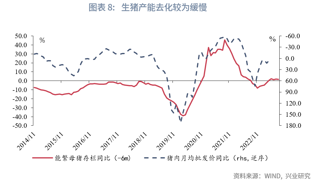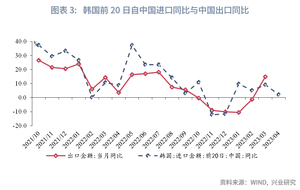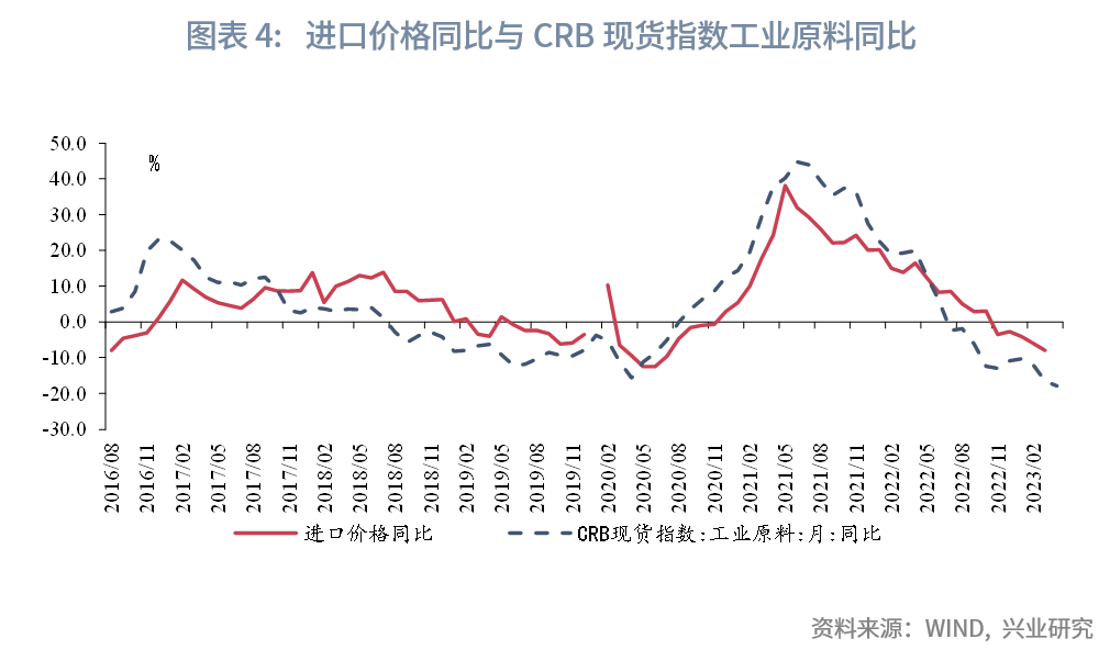 在进口方面,大宗商品价格回落或继续拖累进口同比读数。量价分离来看,2023年2月以来进口数量同比转正,对进口同比读数由拖累转为拉动,而进口价格同比降幅扩大,对进口同比读数的拖累幅度扩大。4月工业原料价格指数同比较前月下降1.4个百分点至-18.0%,降幅进一步扩大,这或从价格层面拖累我国进口同比读数。