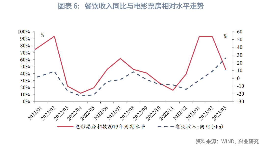 餐饮收入方面,修复动能已明显减弱。以相对平稳的2019年作为基期,2023年1-2月餐饮收入较2019年同期四年复合增速为3.4%;进入3月,当月餐饮收入四年复合增速已降至1.9%。餐饮结构方面,限上限下分化明显,限上修复好于限下,3月限额以上餐饮同比增长37.2%,而限额以下仅增长22.7%。餐饮的分化或指示,尽管商务活动明显恢复,但居民部门餐饮活动在收入和供给双重约束下仍较疲软。餐饮修复动能转弱亦见于整体服务类消费,2023年1-2月电影日均票房约相当于2019年同期的98%,3月票房数据仅相当于2019年同期的46%。截至4月26日,4月票房约为2019年同期的48%。高频数据显示,服务类消费修复减弱或在4月延续,不过,“五一”假期对4月末服务消费有一定提振。