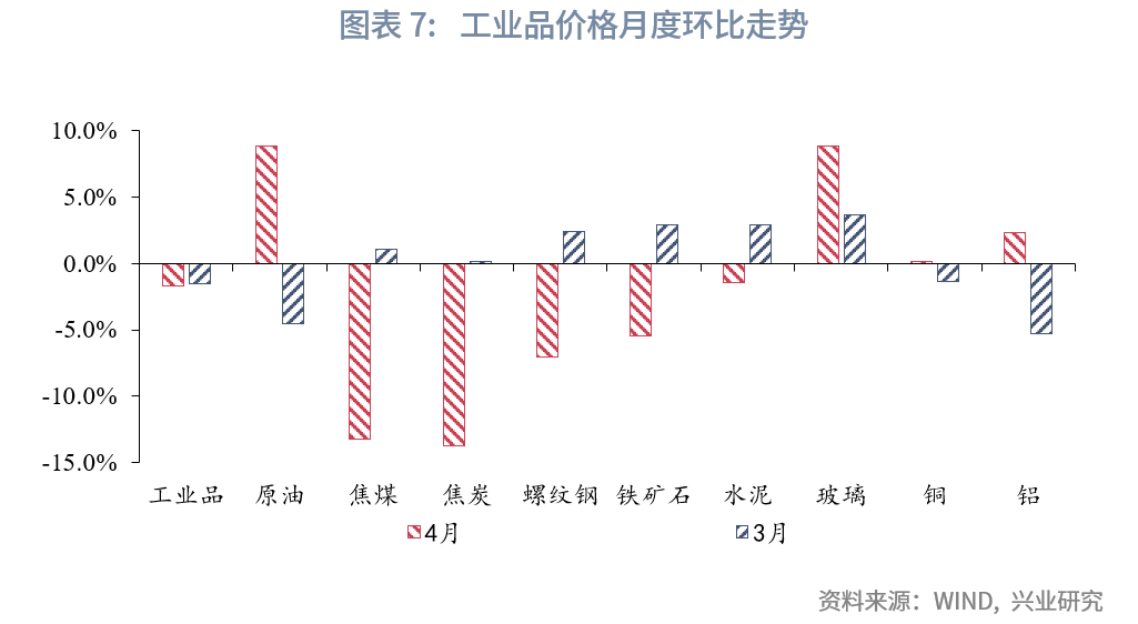 4月工业品价格整体小幅下行,各个品种间分化态势明显,国内定价商品显著走弱,而国际定价商品则较为强势。原油价格4月份环比上升8.8%,OPEC集体自愿性减产对油价形成有力提振。国内定价的黑色系商品则表现较差,螺纹、铁矿环、焦炭环比-7.1%、-5.4%、-13.7%,此前国内定价商品持续强势的特征明显逆转。有色金属价格表现相对平稳,铜、铝环比0.2%、2.3%。综合来看,受去年高基数的影响,4月PPI同比预计录得-3.2%。