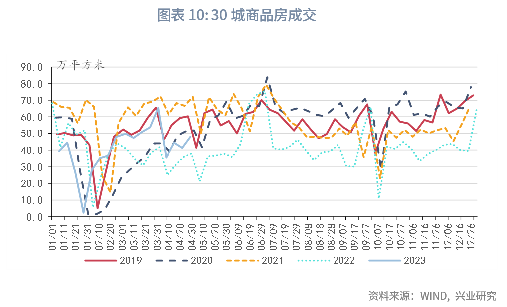 商品零售方面,今年以来稳步复苏,或接力餐饮成为之后消费修复的主要贡献项。2023年1-2月,非汽车一般商品零售较2019年同期四年复合增速为4.6%,3月复合增速小幅提高至5.0%,一般商品温和修复的韧性或在4月进一步延续。汽车销售方面,4月尽管各地强力补贴政策退潮,但考虑到2022年同期基数较低,汽车零售额同比或仍录得较高增速,对商品零售形成支撑。