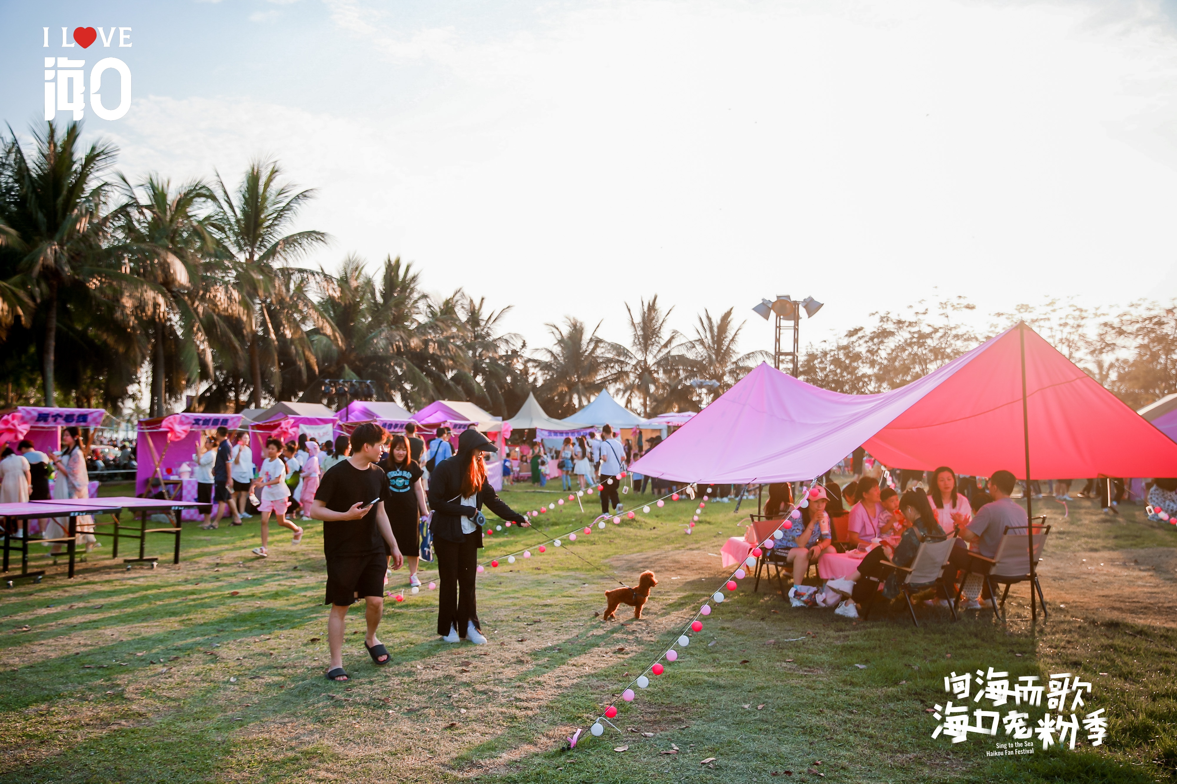 为了营造氛围感十足的活动现场,本次活动延伸了“宠粉”这一主题内涵,现场布置可谓是下足了功夫,无论是市集帐篷还是休闲打卡区,都运用了大面积的粉色色块。傍晚时分,创意十足的粉色市集与海口湾片区的粉色晚霞相得益彰,吸引了不少人驻足围观和打卡拍照。