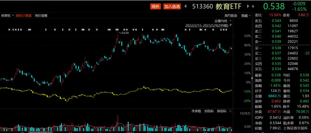 持仓国新文化的教育ETF(513360)今日下挫,盘中跌1.65%,成交额超6600万元,换手率15.48%,盘中交投活跃。