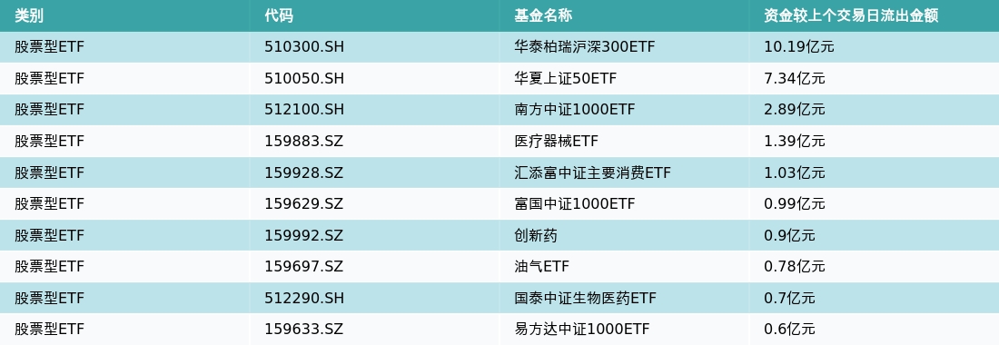 昨日股票型ETF资金流出最多的3支ETF及其流入金额分别为:华泰柏瑞沪深300ETF(流出10.19亿元)、华夏上证50ETF(流出7.34亿元)、南方中证1000ETF(流出2.89亿元)。资金流出前10详情见下表: