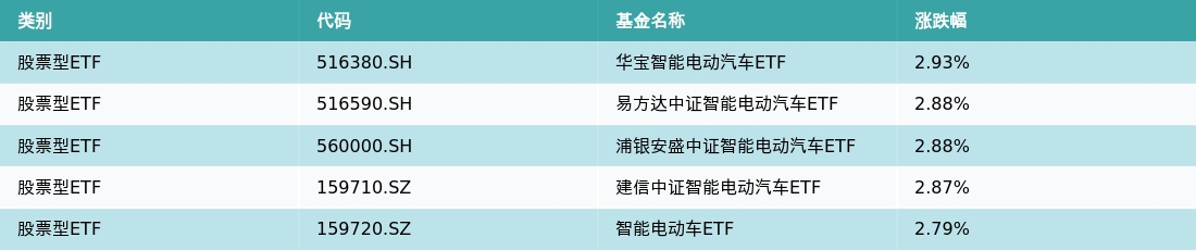 上周股票型ETF涨幅最高的5支ETF及其收益率分别为:华宝智能电动汽车ETF(2.93%)、易方达中证智能电动汽车ETF(2.88%)、浦银安盛中证智能电动汽车ETF(2.88%)、建信中证智能电动汽车ETF(2.87%)、智能电动车ETF(2.79%)。详情见下表: