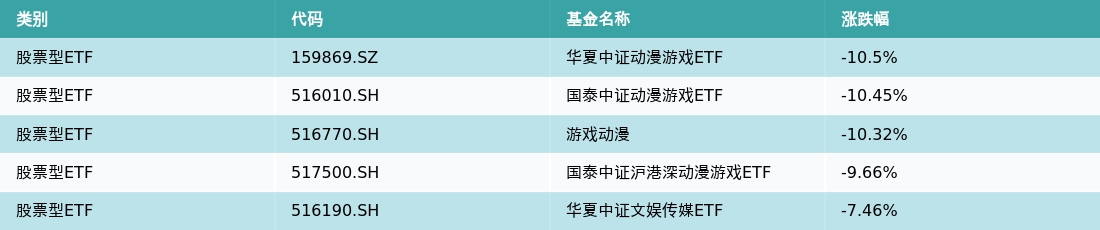 上周股票型ETF跌幅最大的5支ETF及其收益率分别为:华夏中证动漫游戏ETF(-10.5%)、国泰中证动漫游戏ETF(-10.45%)、游戏动漫(-10.32%)、国泰中证沪港深动漫游戏ETF(-9.66%)、华夏中证文娱传媒ETF(-7.46%)。详情见下表: