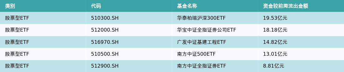 上周股票型ETF资金流出最多的5支ETF及其流入金额分别为:华泰柏瑞沪深300ETF(流出19.53亿元)、华宝中证全指证券公司ETF(流出18.18亿元)、广发中证基建工程ETF(流出14.82亿元)、南方中证500ETF(流出13.01亿元)、南方中证全指证券ETF(流出8.81亿元)。详情见下表: