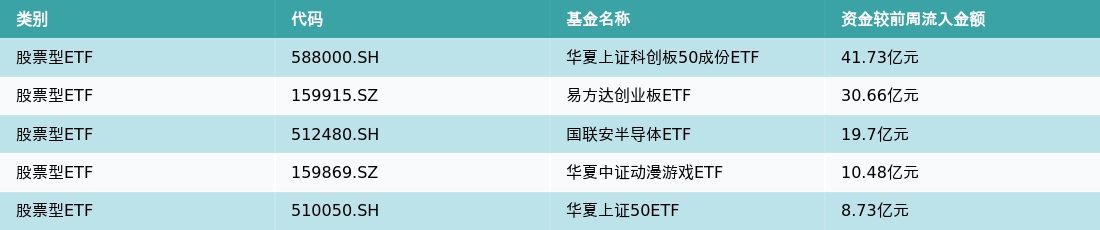 上周股票型ETF资金流入最多的5支ETF及其流入金额分别为:华夏上证科创板50成份ETF(流入41.73亿元)、易方达创业板ETF(流入30.66亿元)、国联安半导体ETF(流入19.7亿元)、华夏中证动漫游戏ETF(流入10.48亿元)、华夏上证50ETF(流入8.73亿元)。详情见下表: