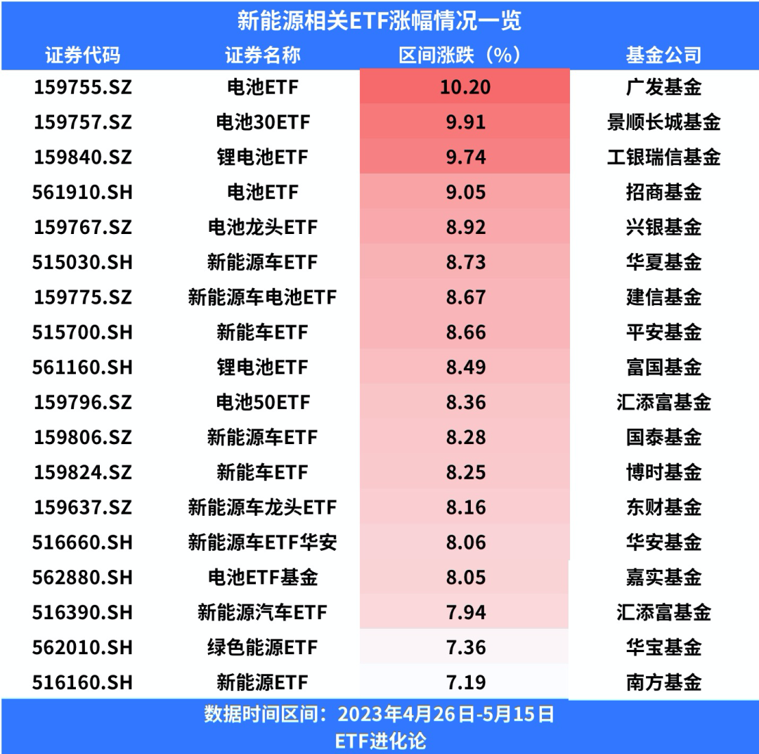 新能源赛道自五一节前底部反弹后,五一节后继续延续涨势,就在市场多方资金悄悄观望之时,一众新能源汽车相关ETF已然悄悄累计不小的涨幅。