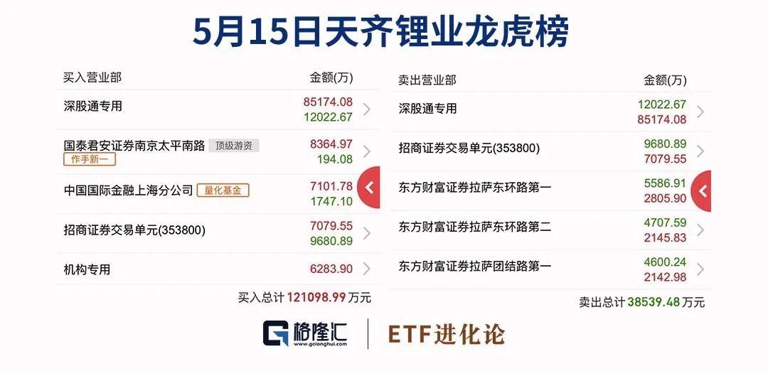 5月15日,锂矿巨头天齐锂业涨停,位于两市净买入排行榜首位。一观龙虎榜,北向狂扫7.3亿元,机构合计净买入6283.9万元。