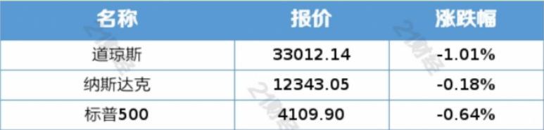 截至当天收盘,道指跌336.46点,跌幅为1.01%,报33012.14点;纳指跌22.16点,跌幅为0.18%,报12343.05点;标普500指数跌26.38点,跌幅为0.64%,报4109.90点。