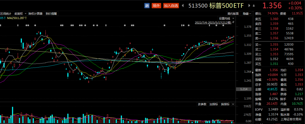 截至午盘,标普500 ETF(513500)涨0.30%,溢价显著,溢价率0.53%。