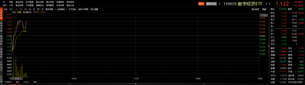 持有多只芯片股的数字经济ETF(159658)早盘翻红,截至发稿,溢折率为0.05%,换手率达1.12%。