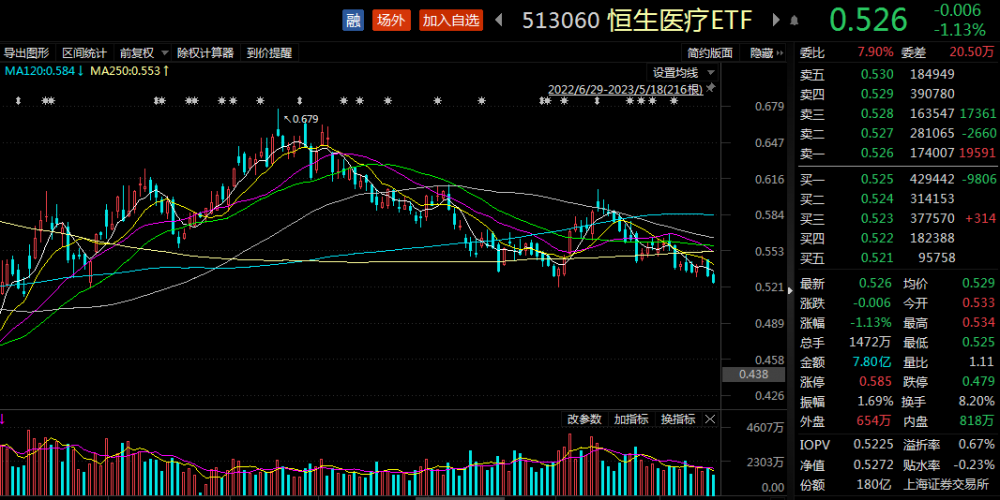 ETF方面,恒生医疗ETF(513060)今日高开走弱,盘中一度翻红,但截至目前,该ETF下跌1.13%,溢折率0.67%,溢价明显,盘中成交额7.80亿元,换手率8.20%,交投活跃。
