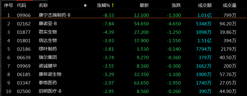 成分股多数下跌,康宁杰瑞制药跌超8%,康诺亚跌近8%,君实生物跌超4%,信达生物、绿叶制药、瑞尔集团等跟跌。