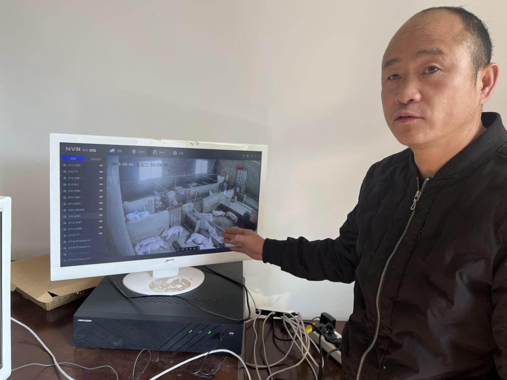 图为2023年2月1日拍摄的何西康通过线上视频监控平台查看猪崽生长情况。