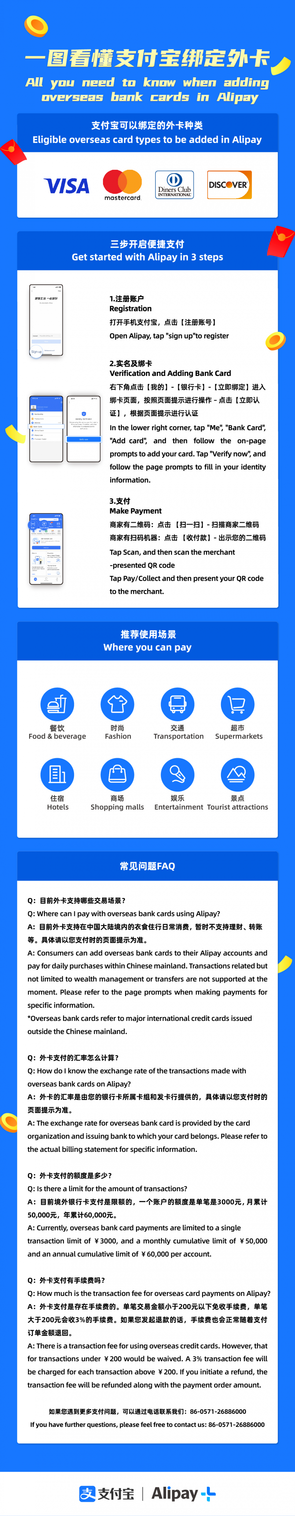 近期,支付宝联合各大国际卡组织,进一步升级了境外用户合作计划。目前,海外用户来华后只需下载支付宝再绑定自己的境外银行卡,即可实现“一部手机游遍中国”, 无需兑换现金,就能在中国的大街小巷畅享便捷的移动支付体验,包括:线下扫码支付买买买、坐公交地铁、打出租车、骑共享单车,线上点外卖、买亚运门票甚至给蚂蚁森林种树。
