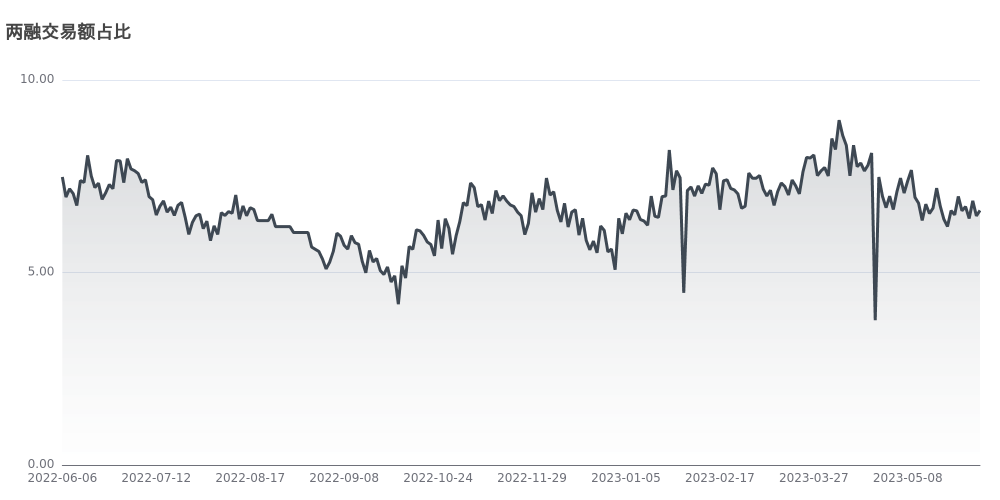 今日该指标值为6.61%,目前该指标处于近一年中立区间,说明投资者对A股持中立情绪。反映场内投资者借钱炒股的杠杆水平,该指标越高说明杠杆水平越高,即投资者认为当前市场较强,反之则说明投资者认为市场相对较弱,因而与上证指数存在较强的正相关性。