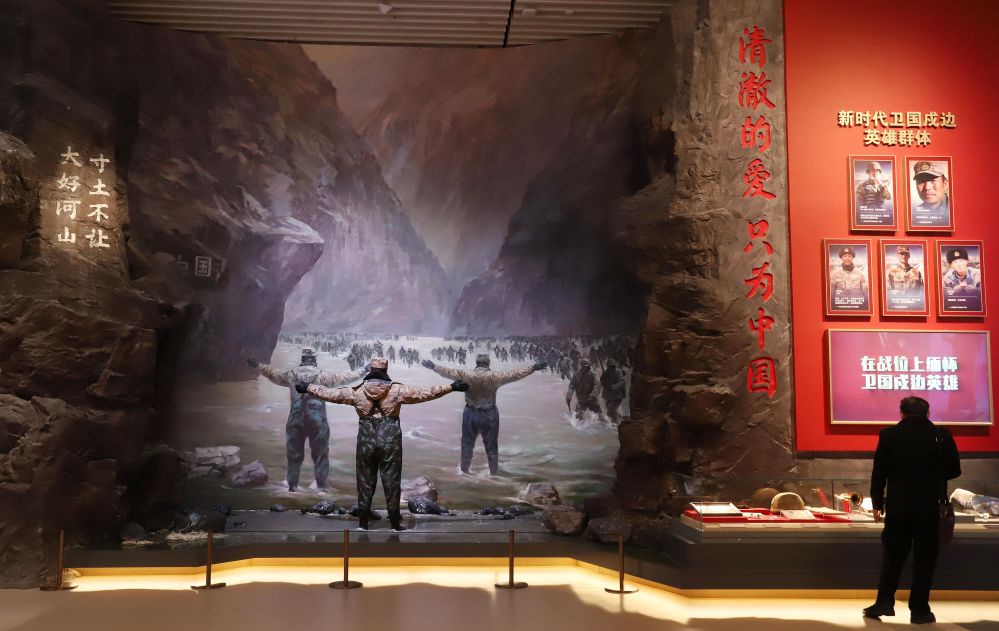 △“领航强军向复兴——新时代国防和军队建设成就展”上展出的卫国戍边英雄事迹。