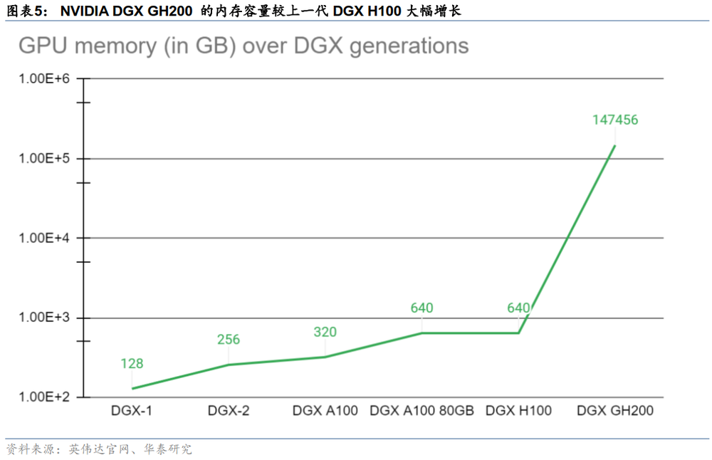 作为H100的升级产品,DGX GH200使用的2.5D的封装工艺虽然较MI300落后,但是英伟达通过 NVLink 互连技术及NVLink Switch System串联了32台由8块GH200超级芯片组成的服务器,可以为用户提供1exaFLOPS的算力与144TB的内存。